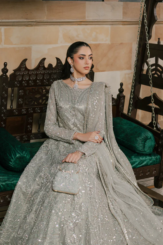 Talk about a princess dress! This silver-grey maxi frock is the epitome of grandeur and luxury, with its unique neckline & full sleeves, the frock is heavily adorned with hand embellishments comprising of stone work, pearls, crystal work & heavy sitari details along with thread embroidery and sequin work. The composed bodice is adorned with embellishments and abstract self-texture play. The sleeves are adorned with Islamic motifs inspired jaal with mini motifs ending with crystal hangings. The back of the bodice is also adorned with embellishment details. The frock itself is the blend of the mixture of textures, jaal embroidery work & heavy pearl embellishments with sitari work, finished with embroidered border & minimal lace. The dupatta is decorated with 4-sided embroidered border, textured floral motifs & sitari spread. Outfit comes with a matching hand embellished clutch & straight pants.
