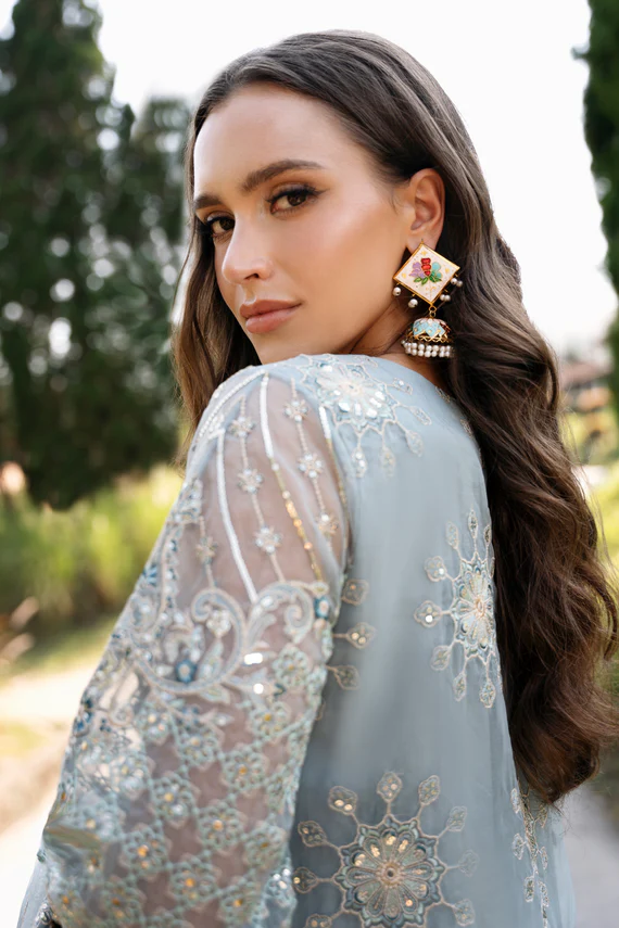 This striking outfit features geometric pattern sheet work with intricate embroidery, Tilla work, and sequins covering the entire shirt. Crystal hangings and delicate lace trims adorn the sleeves’ hem and border, while the round neckline is elegantly enhanced with beadwork. The dupatta showcases detailed borders on all four sides and single border on length sides, complemented by lace trims and geometric motifs throughout. Completing this sophisticated ensemble are culotte trousers with beautifully embroidered hems.